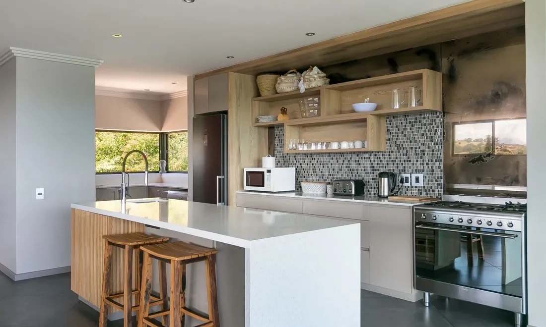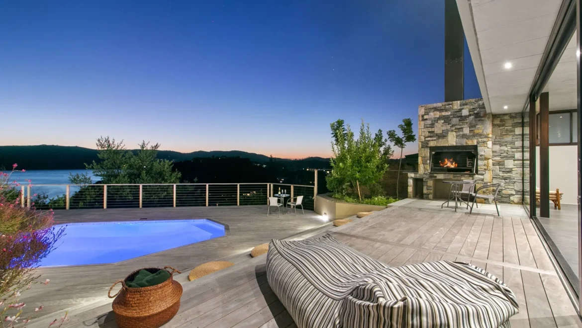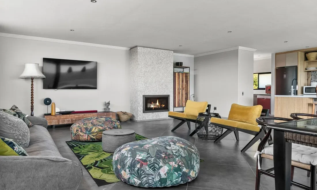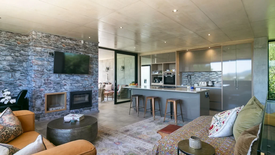 Directly above the bedroom wing is an additional living area: a relaxed lounge with expansive sliding windows showcasing lagoon views, complete with its own combustion wood-burning fireplace, and a second fully equipped kitchen, ideal for casual meals or extended entertaining.