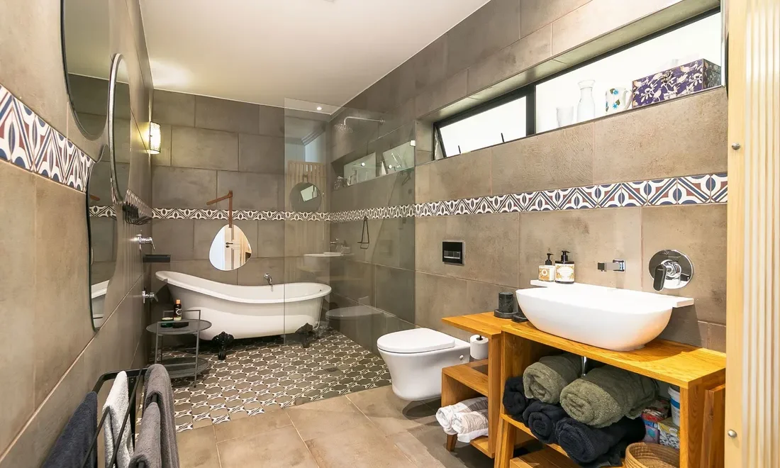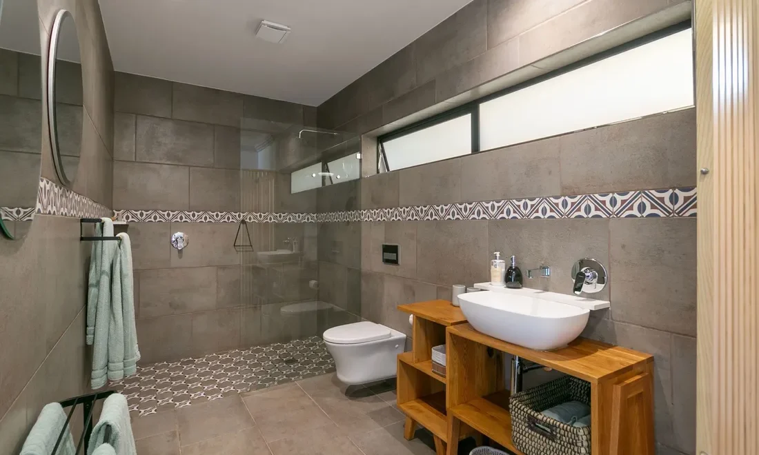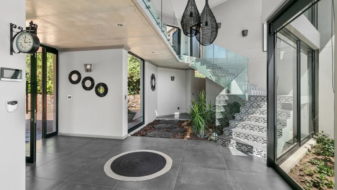 A beautifully tiled Moroccan staircase with glass balustrade leads one from the entrance hall up to the heart of the home: a breathtaking 120sqm main living area.