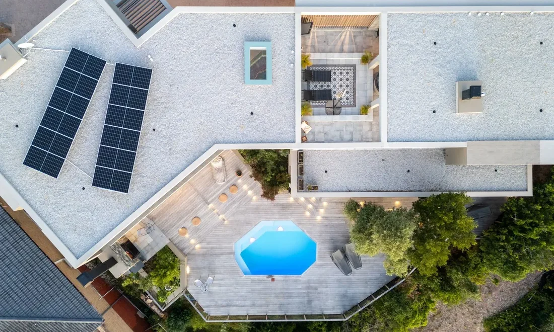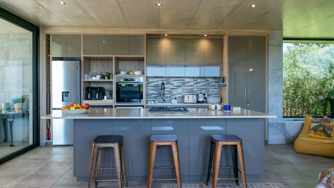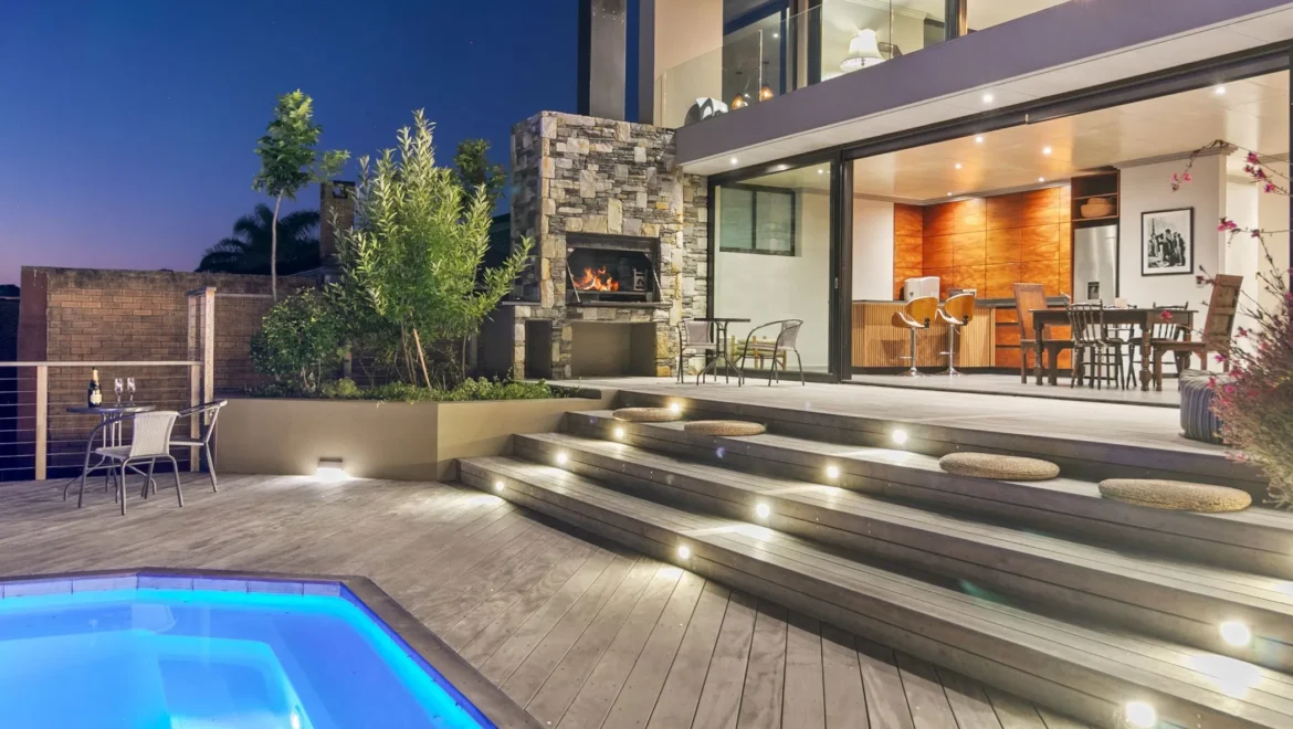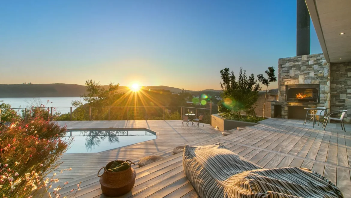 The entrance hall flows into an entertainment area with a bespoke granite bar and wooden wall paneling – an ideal space for hosting and entertaining next to the fire of a hand-built stone braai. Large sliding glass doors open onto a 200sqm Garapa terraced wooden deck, creating seamless indoor-outdoor flow. The deck, with its soft built-in lighting, frames an octagonal swimming pool. Sit on the deck for hours, watching the rise and fall of the tides and the shifting shades of blue in the lagoon below.