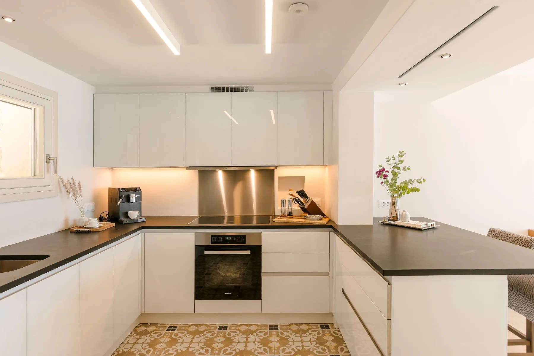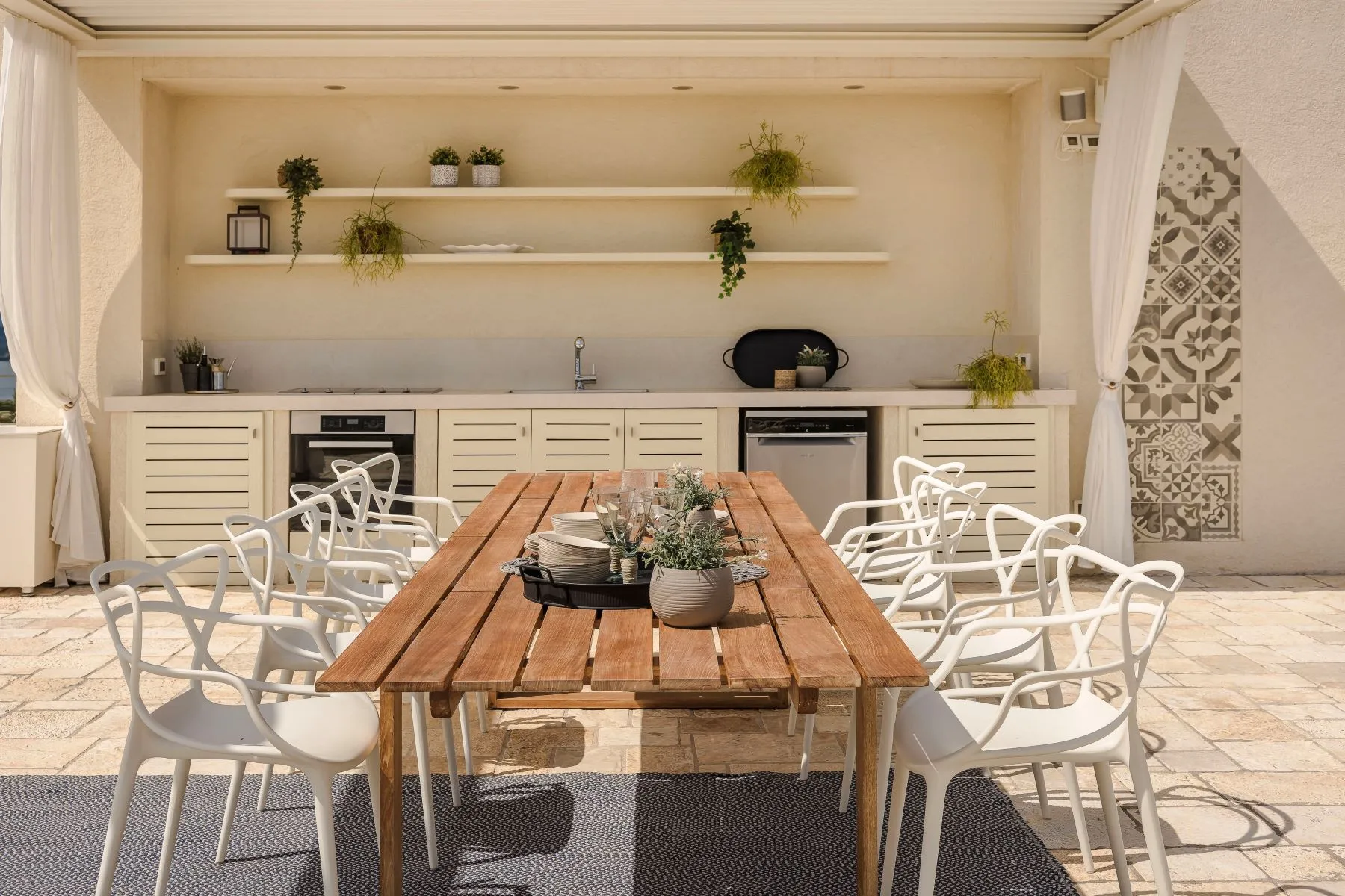 A refined smart home with open-plan living and dining areas, a contemporary kitchen, 3 ensuite bedrooms, office space, sauna, multiple terraces, outdoor kitchen, BBQ area, and poolside amenities.