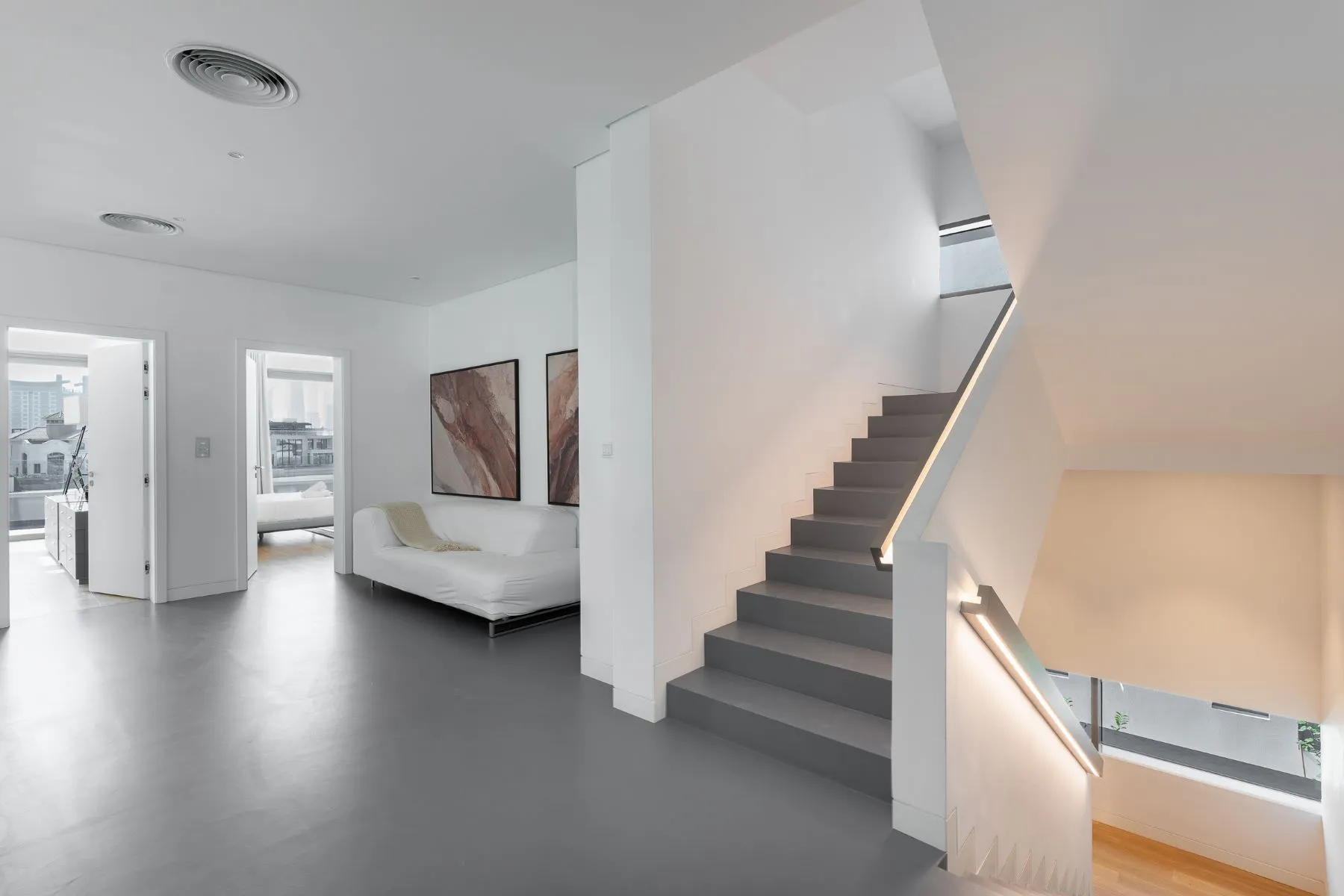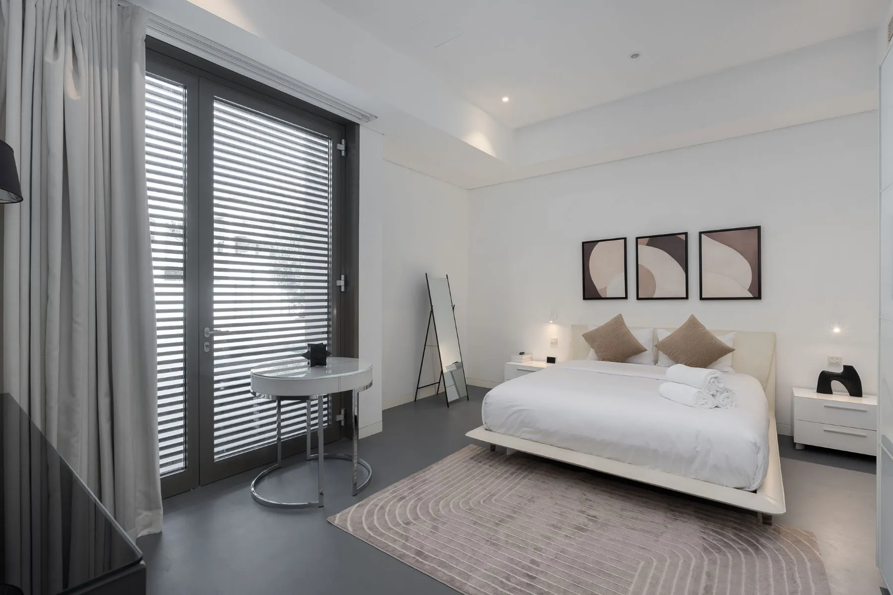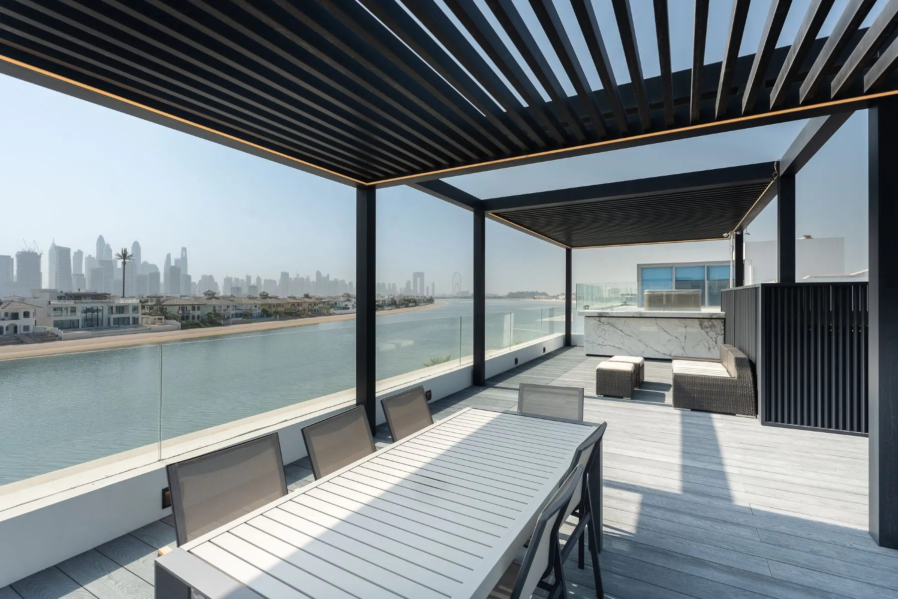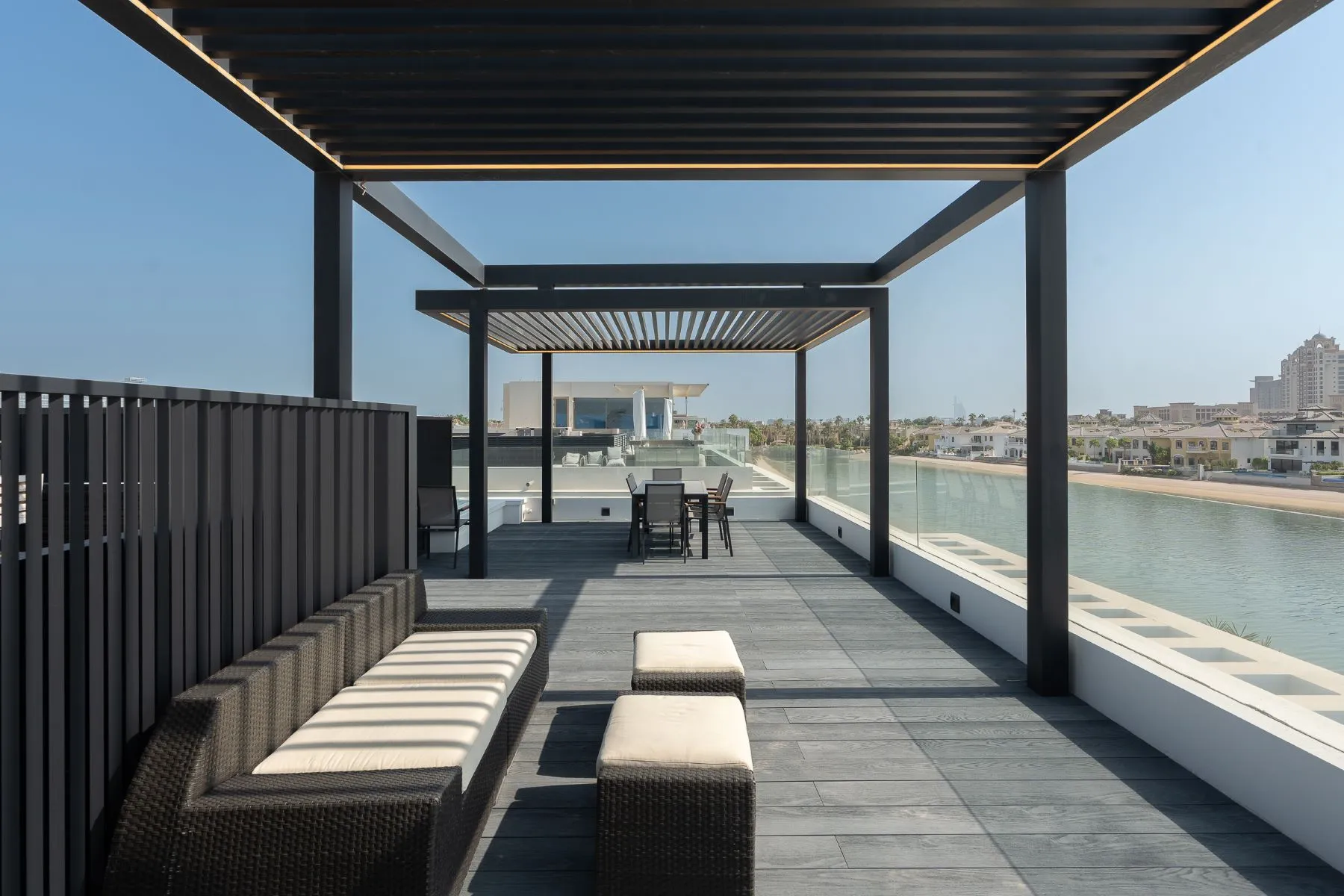 All five bedrooms feature luxurious en-suite bathrooms, bespoke built-in storage, and access to private terraces, offering beautiful views of the surrounding neighbourhood and the Arabian Gulf. The upper level reveals a serene rooftop terrace, ideal for gatherings or quiet evenings, with sweeping 360-degree views of the Dubai skyline and tranquil waters beyond.