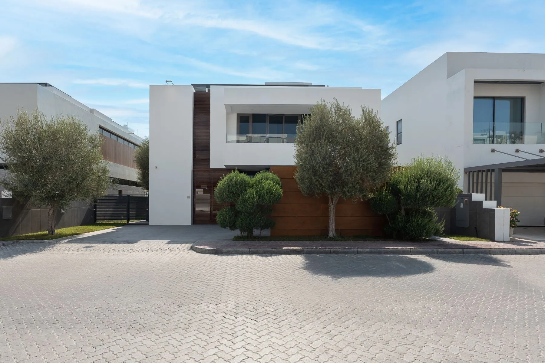 Discreetly positioned behind a landscaped green frontage with mature trees and a low boundary fence, the residence immediately conveys exclusivity. Inside, the villa showcases a sophisticated contemporary aesthetic, highlighted by double-height ceilings and expansive floor-to-ceiling windows that flood the interiors with natural light. Premium finishes, including solid oak flooring, reflect exceptional craftsmanship throughout.