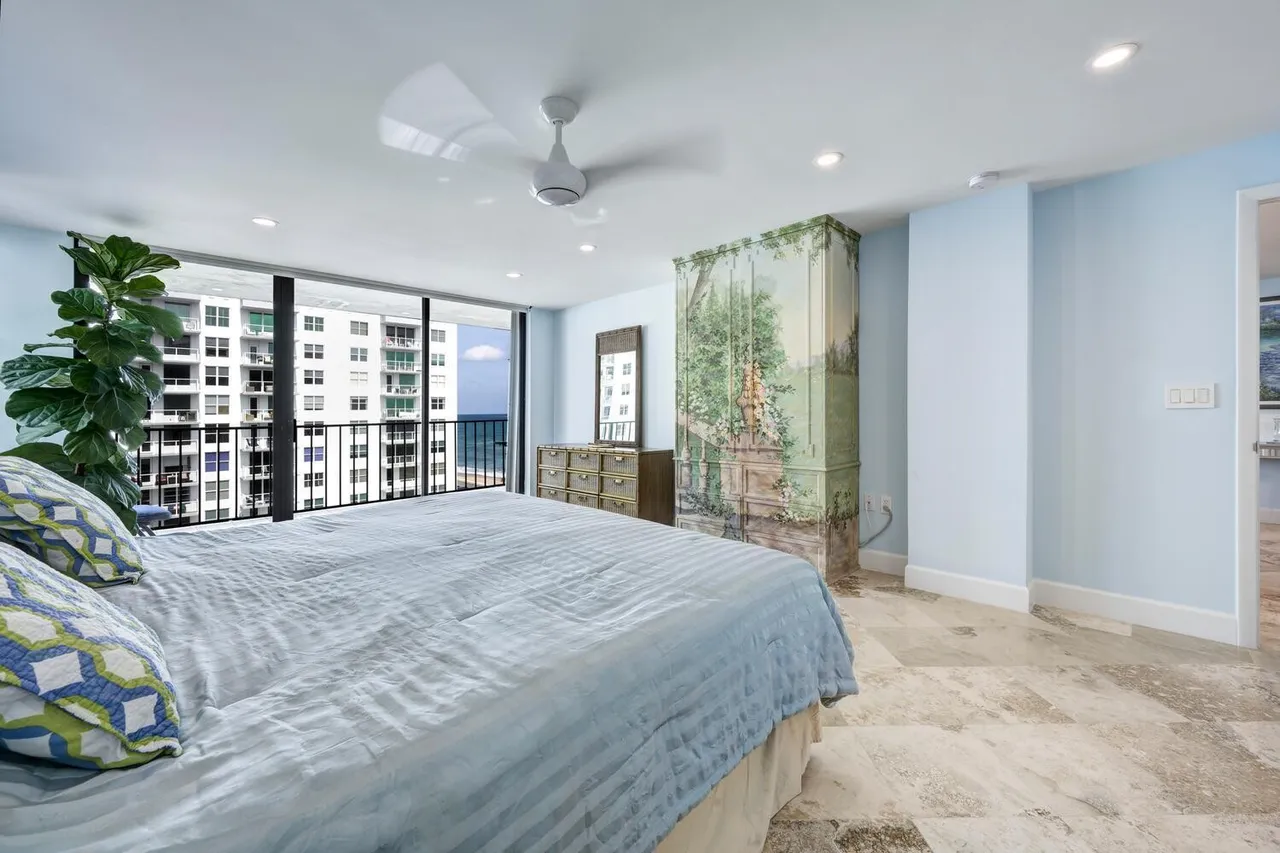 Sweeping ocean-to-intracoastal views and an open floor plan define this beautifully renovated beachfront condo. Completed in 2021, the light-filled residence features an elegant chef’s kitchen with calcite slab countertops, custom cabinetry, and matte white Café appliances.